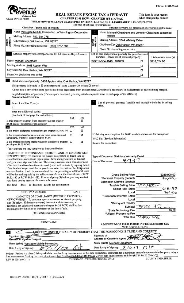 | 2 | 08/07/2017 | WD | Warranty Deed | WESTGATE MOBILE HOMES, INC. | CHEATHAM, MICHAEL | | | $193,900.00 | 30608 | 4428020 |