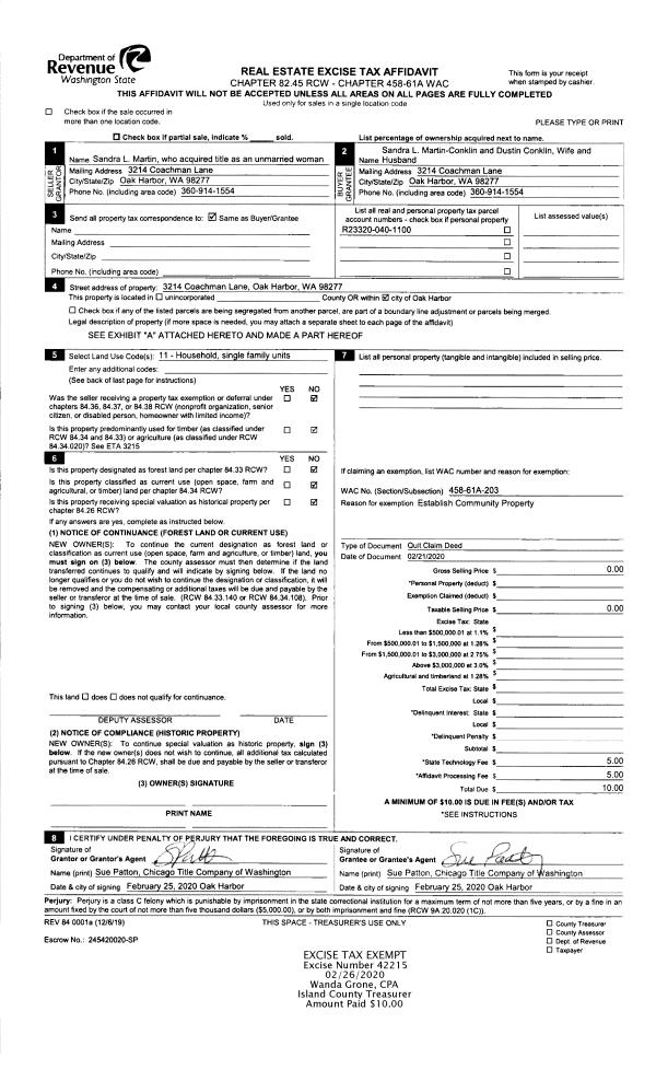 | 1 | 02/21/2020 | QCD | Quit Claim Deed | MARTIN, SANDRA L | MARTIN-CONKLIN, SANDRA L | | | $0.00 | 42215 | 4481954 |