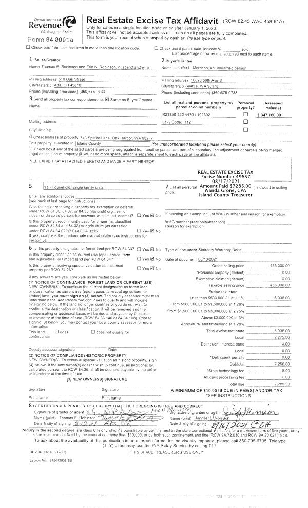 | 1 | 08/17/2021 | WD | Warranty Deed | ROBINSON, THOMAS E | MORRISON, JENNIFER L | | | $455,000.00 | 49657 | 4527025 |