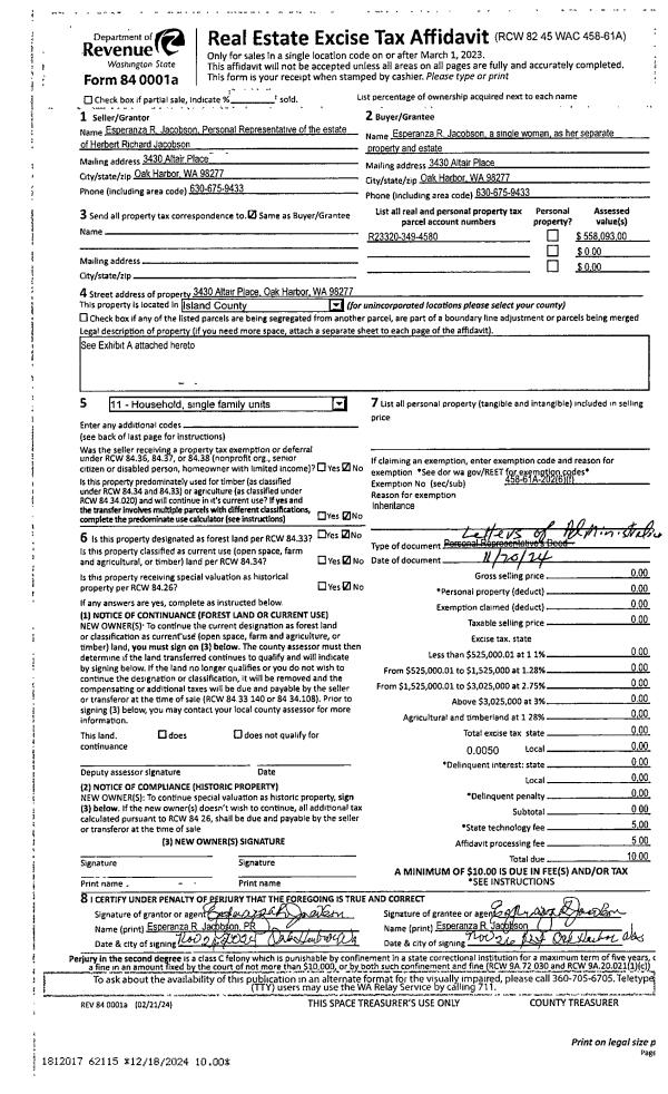 | 1 | 11/26/2024 | PRD | Personal Representatives Deed | ESPERANZA T JACOBSON, PR | JACOBSON, ESPERANZA R | | | $0.00 | 62116 | 4580507 |