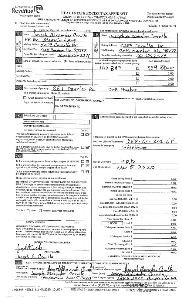 | 1 | 11/05/2020 | PRD | Personal Representatives Deed | LANG, MARVIN C | CERULLO, JOSEPH ALEXANDER | | | $0.00 | 45562 | 4501553 |