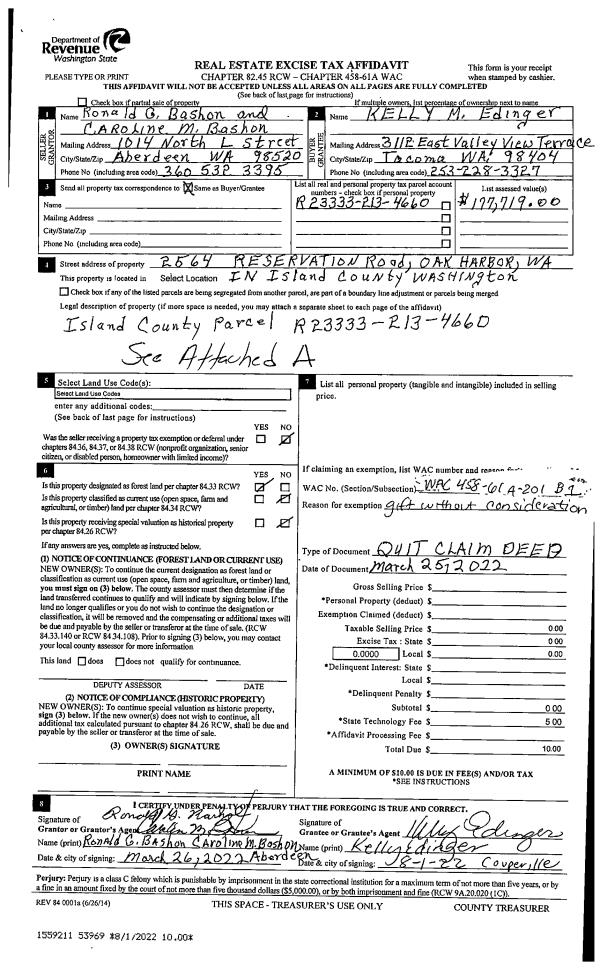 | 2 | 03/25/2022 | QCD | Quit Claim Deed | BASHON, RONALD G | EDINGER, KELLY M | | | $0.00 | 53969 | 4548934 |
