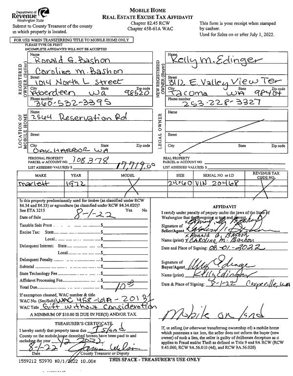| 1 | 08/01/2022 | MANHOME | Manufactured Home | BASHON, RONALD G | EDINGER, KELLY M | | | $0.00 | 53970 | |
