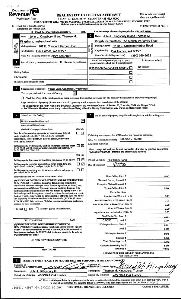 | 1 | 04/23/2020 | QCD | Quit Claim Deed | KINGSBURY, JOHN L | KINGBURY III TTEE, JOHN L | | | $0.00 | 42967 | 4486433 |