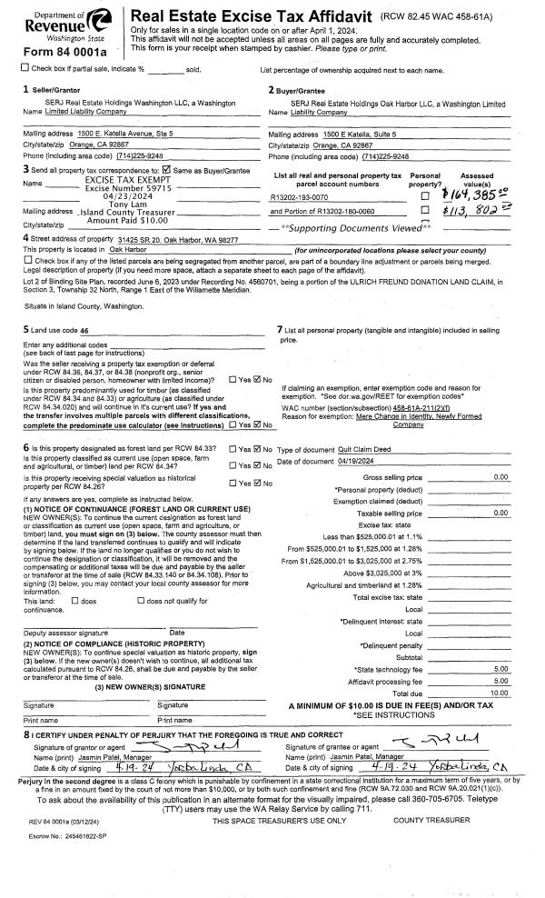| 2 | 04/19/2024 | QCD | Quit Claim Deed | SERJ REAL ESTATE HOLDINGS WASHINGTON, LLC | SERJ REAL ESTATE HOLDINGS OAK HARBOR LLC | | | $0.00 | 59715 | 4571538 |