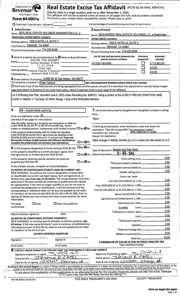 | 1 | 11/19/2024 | BARGSLD | Bargain And Sale Deed | SERJ REAL ESTATE HOLDINGS OAK HARBOR LLC | INDO-NORDIC REAL ESTATE HOLDINGS LLC | | | $0.00 | 61895 | 4579683 |