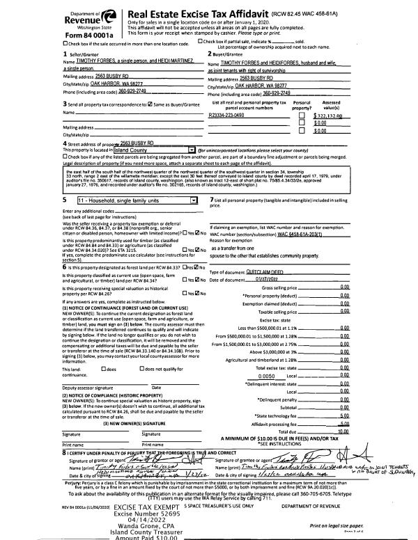| 1 | 01/27/2022 | QCD | Quit Claim Deed | FORBES, TIMOTHY | FORBES JTWROS, TIMOTHY | | | $0.00 | 52695 | 4543311 |