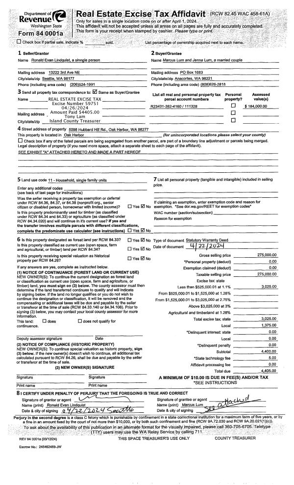 | 1 | 04/22/2024 | WD | Warranty Deed | LINDQUIST, RONALD E | LUM, MARCUS | | | $275,000.00 | 59751 | 4571634 |