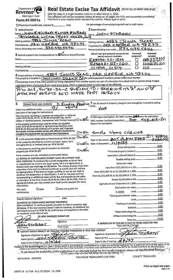 | 1 | 11/04/2024 | QCD | Quit Claim Deed | STOBART TTEE, JOHN B | STOBART, JOHN B | | | $0.00 | 61768 | 4579127 |