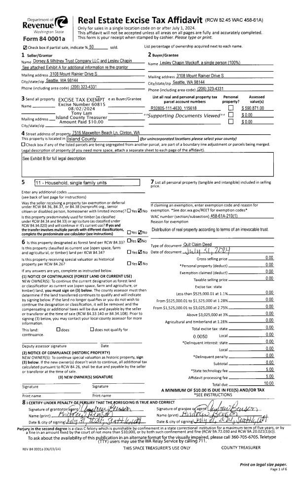 | 2 | 07/31/2024 | QCD | Quit Claim Deed | WYCKOFF, LESELY CHAPIN | WYCKOFF, LESLEY CHAPIN | | | $0.00 | 60815 | 4575345 |