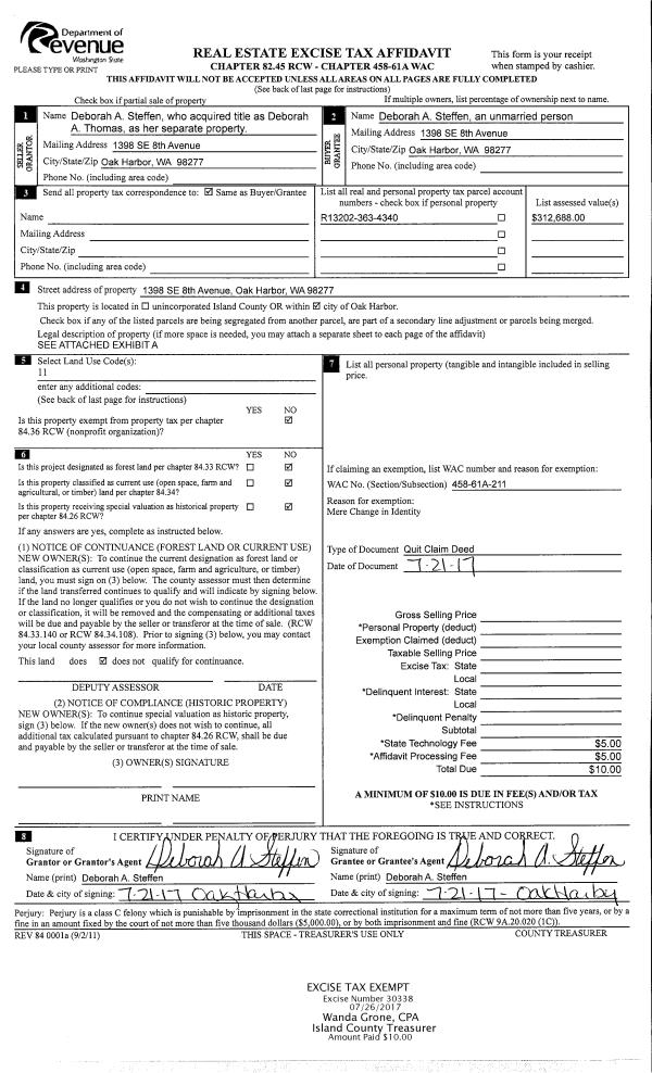 | 4 | 07/21/2017 | QCD | Quit Claim Deed | THOMAS, DEBORAH A | STEFFEN, DEBORAH A | | | $0.00 | 30338 | 4426910 |