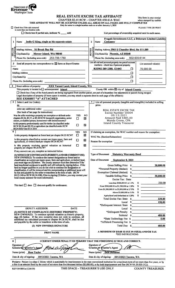 | 3 | 09/08/2021 | WD | Warranty Deed | KING, INDLE G | FRAGALE INVESTMENTS, LLC | | | $30,000.00 | 50004 | 4528962 |