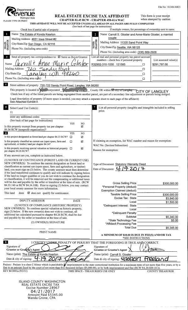 | Mailing Address: | ANNE-MARIE GLOSTER 720 SAND POINT WAY LANGLEY, WA 98260-9529 | % Ownership: | 100.0000000000% |