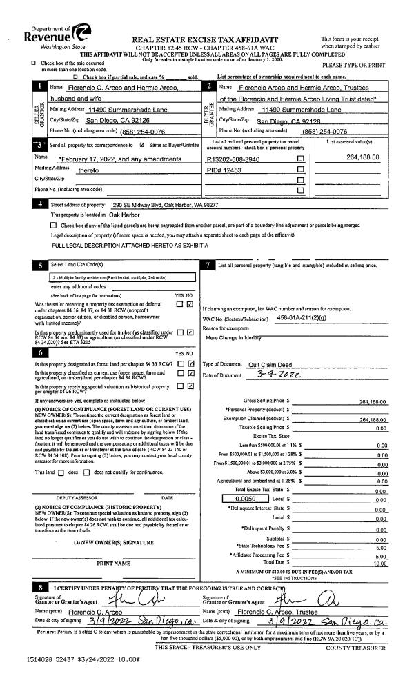 | 1 | 03/09/2022 | QCD | Quit Claim Deed | ARCEO, FLORENCIO C | ARCEO TTEE, FLORENCIO | | | $0.00 | 52437 | 4542133 |