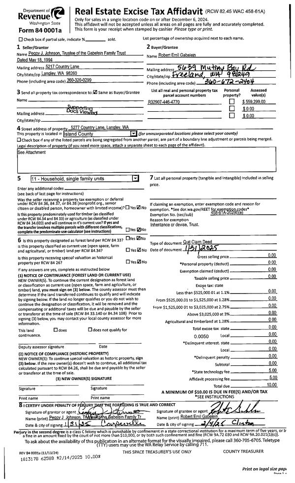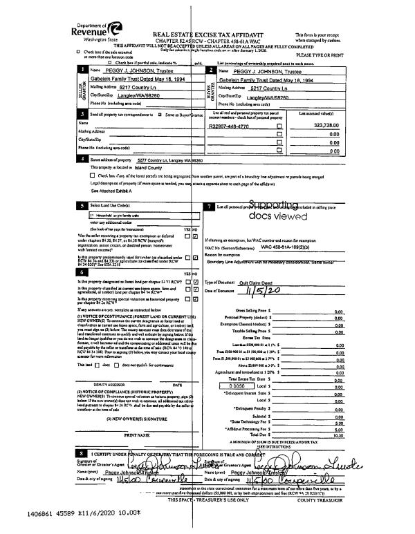 | 2 | 11/05/2020 | QCD | Quit Claim Deed | GABELEIN TRUSTEE, RAYNARD | JOHNSON TTEE, PEGGY J | | | $0.00 | 45589 | 4501719 |