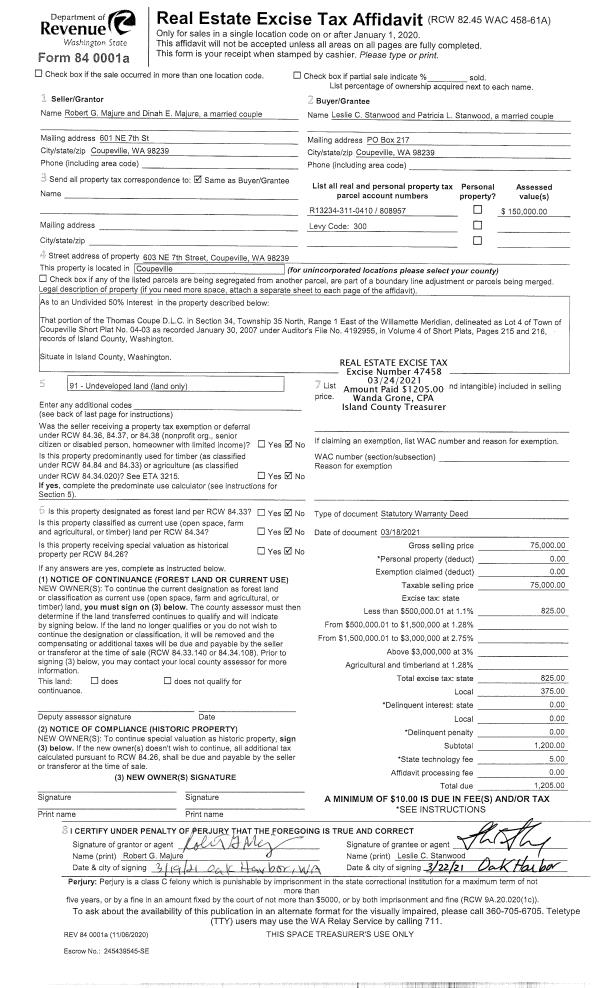 | Tax Area: | 719 - APPRAISER-S Whid Schl Dist, outside Langley, vacant & 50 acres or less | Land Use Code | 91 |