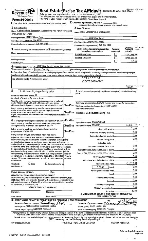 | 3 | 08/25/2021 | TRUSTEED | Trustee's Deed | PIKE TRUSTEES, ALFRED L & EVELYN M | PIKE, BRUCE LENARD | | | $0.00 | 49814 | 4527876 |