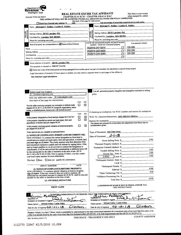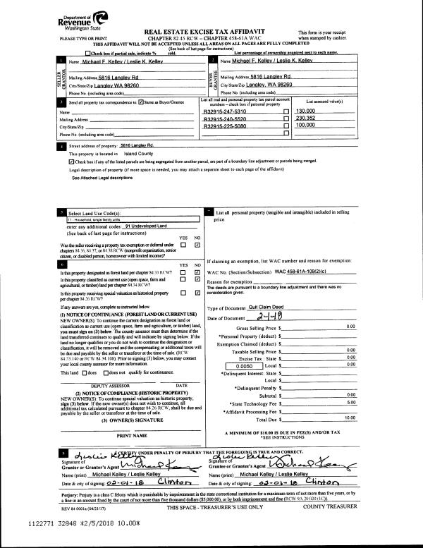 | 5 | 02/01/2018 | QCD | Quit Claim Deed | KELLEY, MICHAEL F | KELLEY, MICHAEL F | | | $0.00 | 32850 | 4438634 |