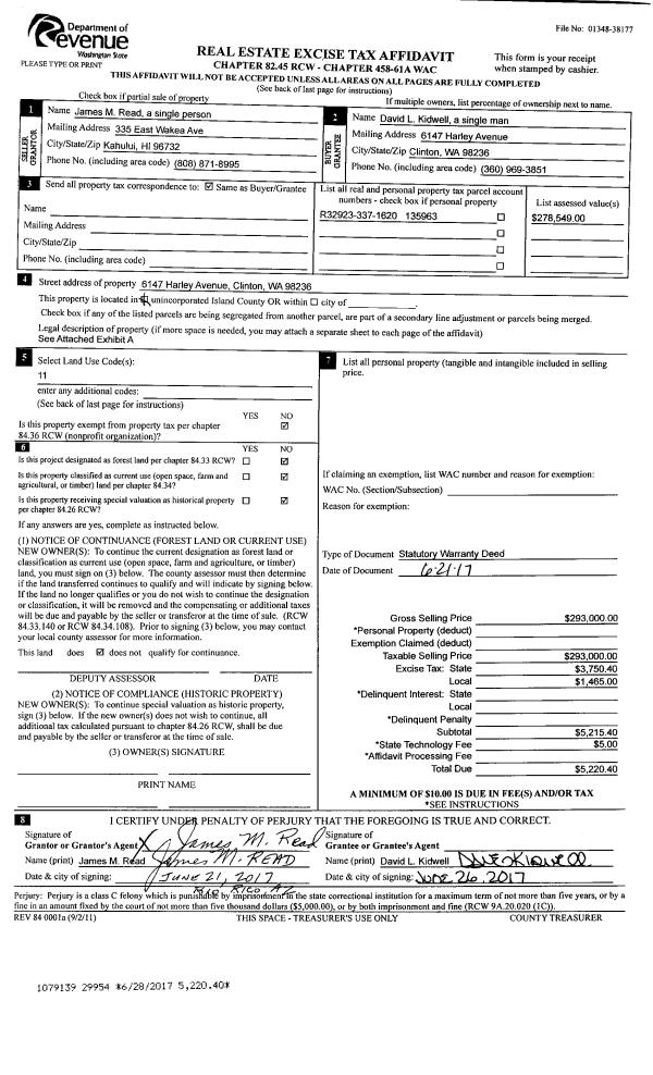 | 2 | 06/21/2017 | WD | Warranty Deed | READ, JAMES | KIDWELL, DAVID L | | | $293,000.00 | 29954 | 4425163 |