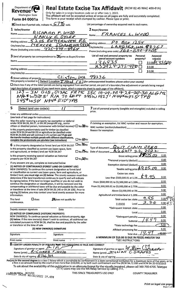 | 1 | 08/26/2022 | QCD | Quit Claim Deed | WOOD, RICHARD F | WOOD, FRANCES L | | | $905.00 | 54355 | 4550466 |