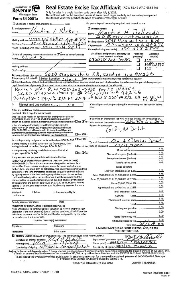 | 2 | 10/12/2022 | QCD | Quit Claim Deed | BLAKEY, VICKIE L | BALLARDO, MARTIN H | | | $0.00 | 54836 | 4552486 |