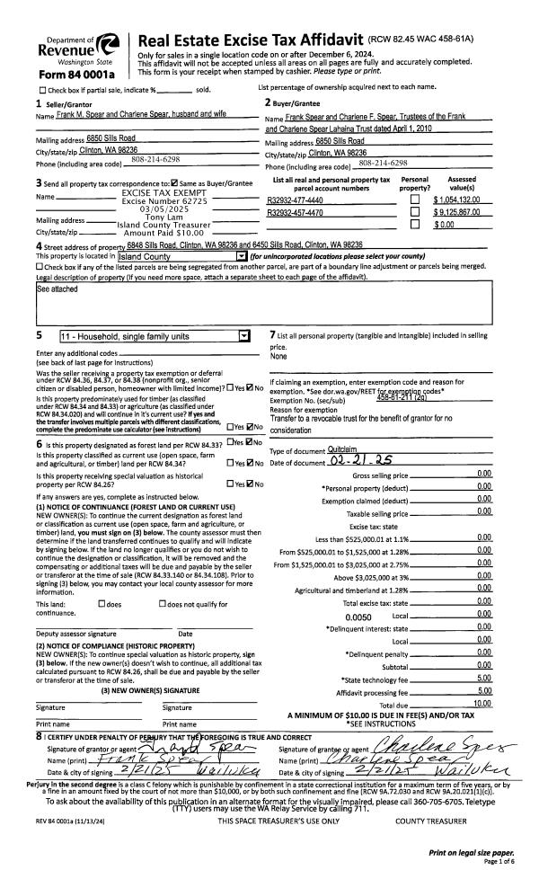 | Mailing Address: | CHARLENE F SPEAR TTEE 6850 SILLS RD CLINTON, WA 98236 | % Ownership: | 100.0000000000% |