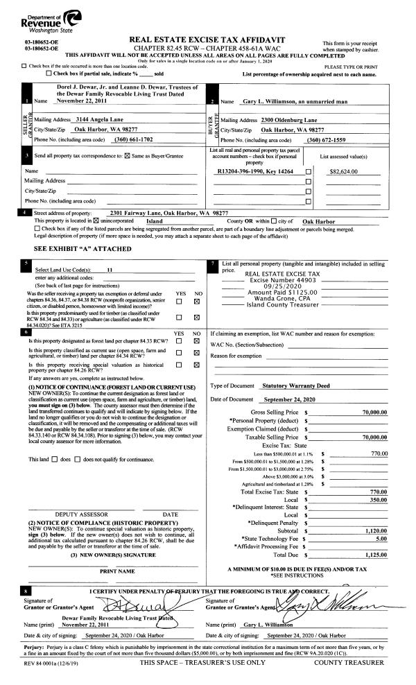 | 1 | 09/24/2020 | WD | Warranty Deed | DEWAR JR TRUSTEE, DOREL J | WILLIAMSON, GARY L | | | $70,000.00 | 44903 | 4497559 |