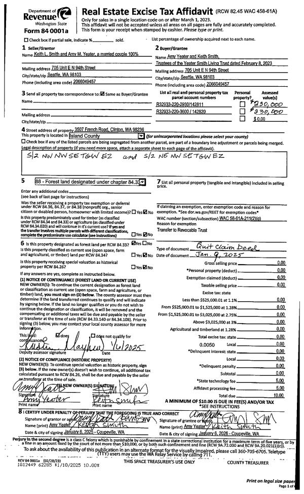 | 1 | 01/09/2025 | QCD | Quit Claim Deed | SMITH, KEITH L | YEATER TTEE, AMY | | | $0.00 | 62285 | 4581141 |