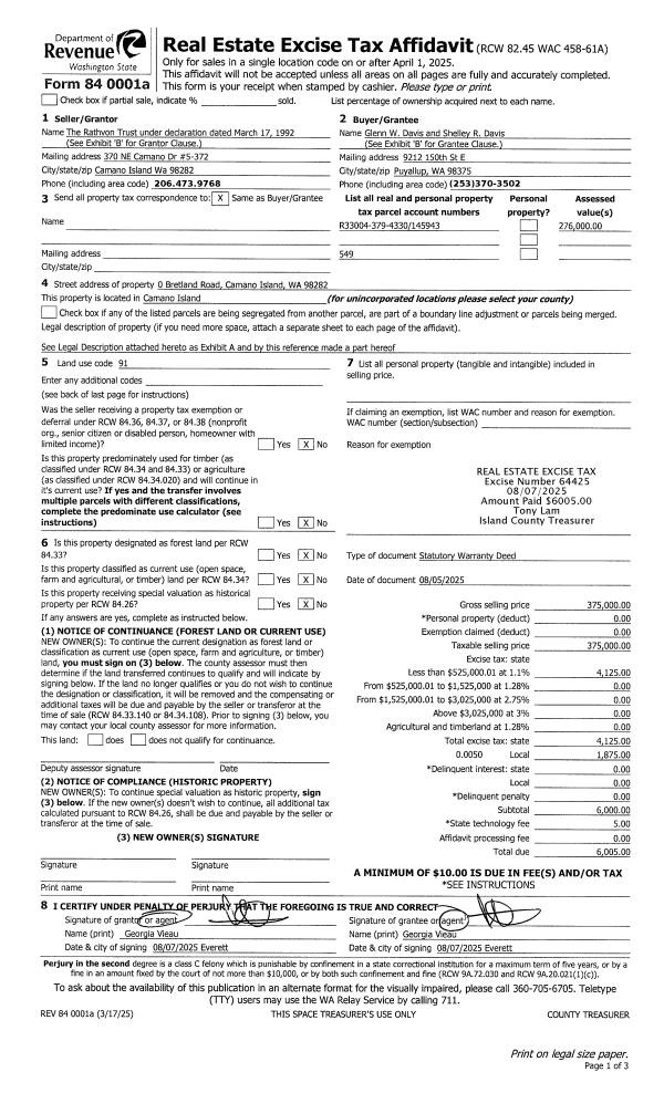 | 1 | 08/05/2025 | WD | Warranty Deed | RATHVON TRUSTEE, WILLIAM P | DAVIS, GLENN W | | | $375,000.00 | 64425 | 4589354 |