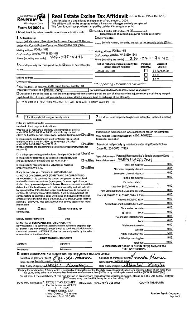 | Mailing Address: | 1756 CASSIDY COURT CAMANO ISLAND, WA 98282 | % Ownership: | 100.0000000000% |