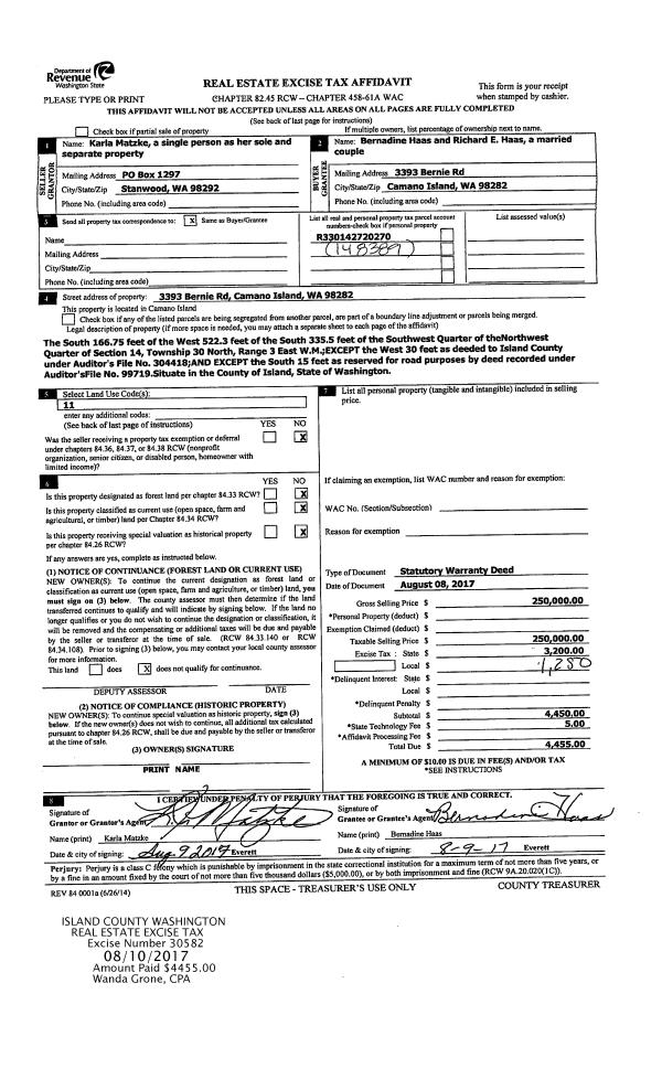 | 1 | 08/08/2017 | WD | Warranty Deed | MATZKE, KARLA J | HAAS, BERNADINE | | | $250,000.00 | 30582 | 4427928 |