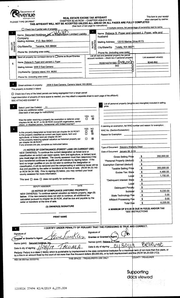 | Mailing Address: | LEONARD J PYPER 3306 S EAST CAMANO CAMANO ISLAND, WA 98282 | % Ownership: | 100.0000000000% |