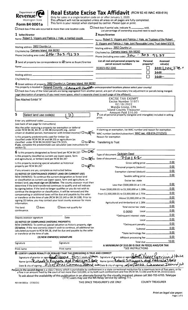 | 1 | 02/10/2022 | QCD | Quit Claim Deed | VIGGERS, ROBERT S | VIGGERS TTEE, ROBERT S | | | $0.00 | 51971 | 4539801 |