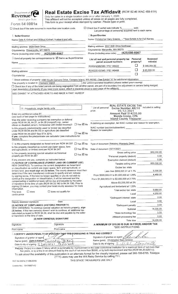 | 1 | 05/11/2021 | WD | Warranty Deed | KINHART, DALE A & WILTRUD | GREENE, CHRISTOPHER GARY | | | $850,000.00 | 48210 | 4519022 |