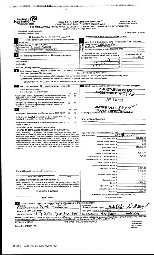 | 4 | 04/21/2020 | WD | Warranty Deed | BARTANEN, JOHN E | CHRISTENSEN, DALE E | | | $555,000.00 | 42823 | 4485338 |