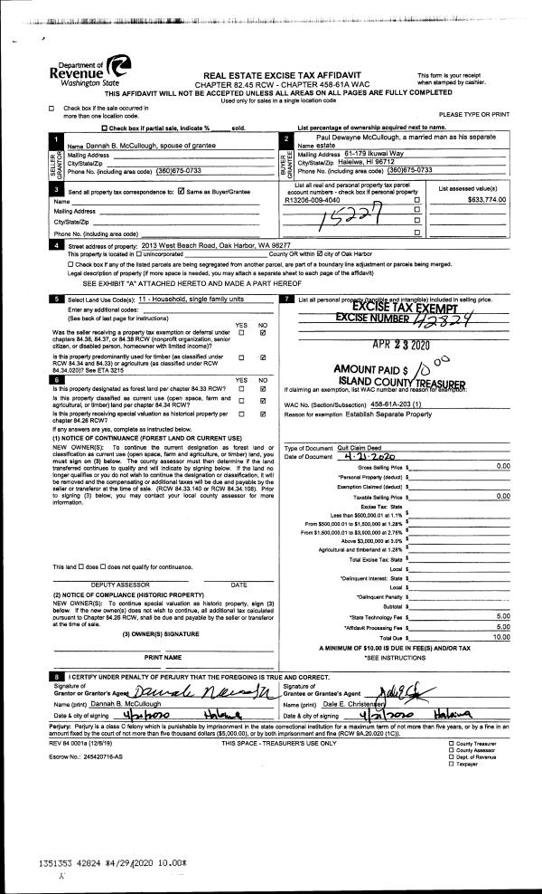 | 3 | 04/21/2020 | QCD | Quit Claim Deed | MCCULLOUGH, DANNAH B | CHRISTENSEN, DALE E | | | $0.00 | 42824 | 4485340 |