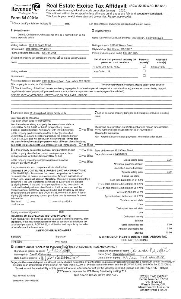 | Mailing Address: | PAUL MCCULLOUGH 2013 WEST BEACH ROAD OAK HARBOR, WA 98277 | % Ownership: | 100.0000000000% |