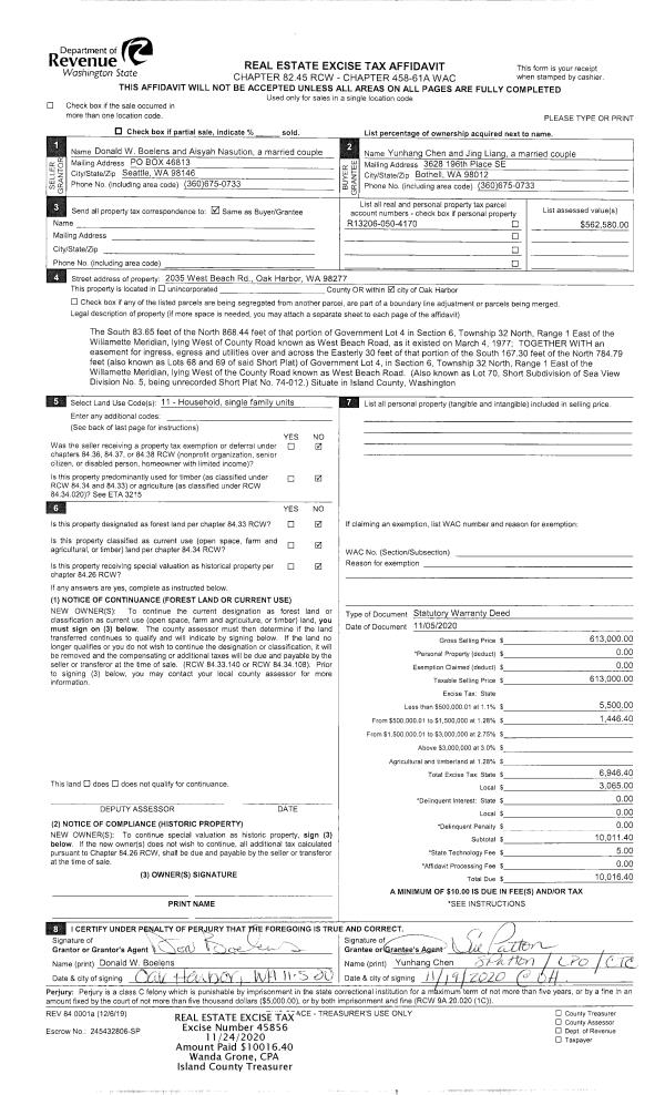 | 1 | 11/08/2023 | WD | Warranty Deed | CHEN, YUNHANG | TWENTY THIRTY FIVE WEST BEACH TRUST | | | $0.00 | 58492 | 4566673 |