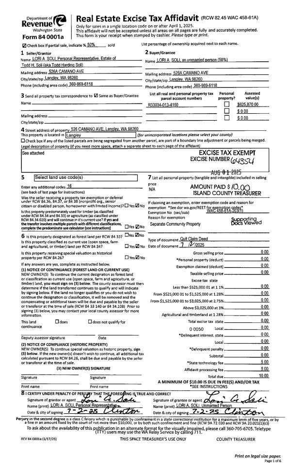 | Mailing Address: | LORI A SOLI 526A CAMANO AVE LANGLEY, WA 98260 | % Ownership: | 100.0000000000% |