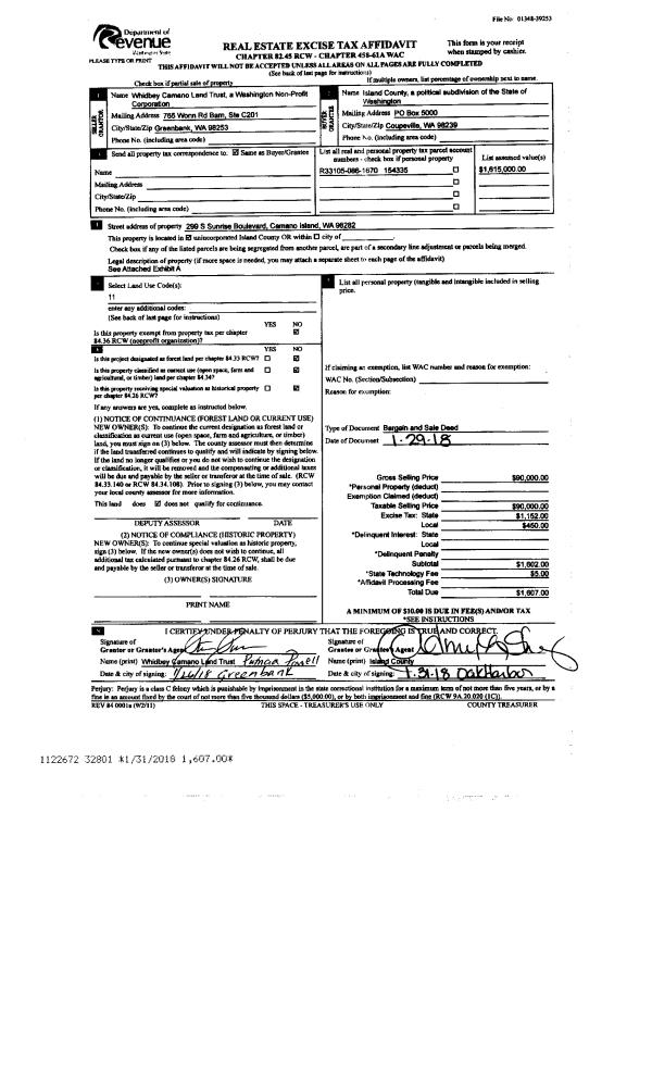 | 1 | 01/29/2018 | BARGSLD | Bargain And Sale Deed | WHIDBEY CAMANO LAND TRUST | ISLAND COUNTY | | | $90,000.00 | 32801 | 4438399 |