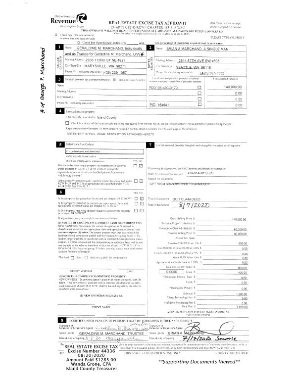 | 1 | 08/07/2020 | QCD | Quit Claim Deed | MARCHAND TRUSTEE, GERALDINE | MARCHAND, BRIAN A | | | $80,000.00 | 44336 | 4494383 |