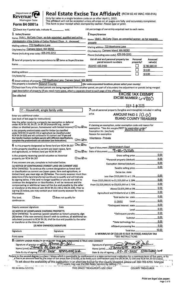 | 1 | 09/15/2025 | DEED PA | Deed of Personal Administrator | VICKI L MCCARTY OLSON, ADMINISTRATOR | MCCARTY OLSON, VICKI L | | | $0.00 | 64880 | 4591211 |