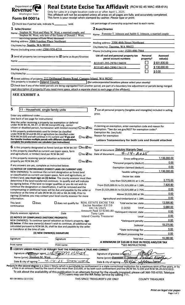 | 1 | 04/14/2025 | WD | Warranty Deed | WEST, DONALD J | JOHNSON, FORRESTER T | | | $1,136,000.00 | 63159 | 4584593 |