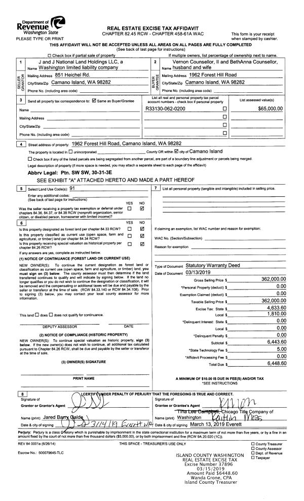 | 2 | 03/13/2019 | WD | Warranty Deed | J AND J NATIONAL LAND HOLDINGS, LLC | COUNSELLOR II, VERNON | | | $362,000.00 | 37896 | 4460592 |