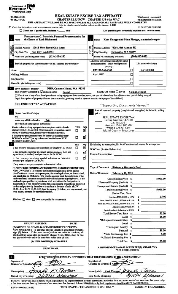 | 1 | 02/10/2021 | WD | Warranty Deed | RICHMOND, RUTH F | FLUEGGE, KURT | | | $5,000.00 | 47000 | 4511339 |