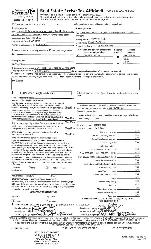 | 1 | 07/08/2022 | QCD | Quit Claim Deed | KECK, THOMAS M | PORT SUSAN BEACH CABIN, LLC | | | $0.00 | 53714 | 4547817 |