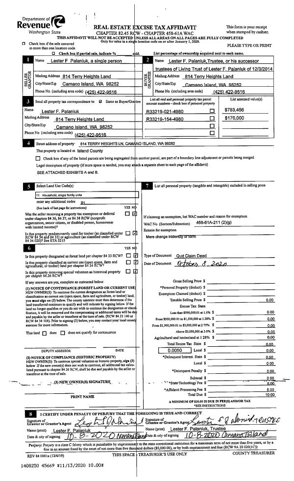 | 1 | 10/08/2020 | QCD | Quit Claim Deed | PALANIUK, LESTER | PALANIUK TTEE, LESTER F | | | $0.00 | 45669 | 4502455 |