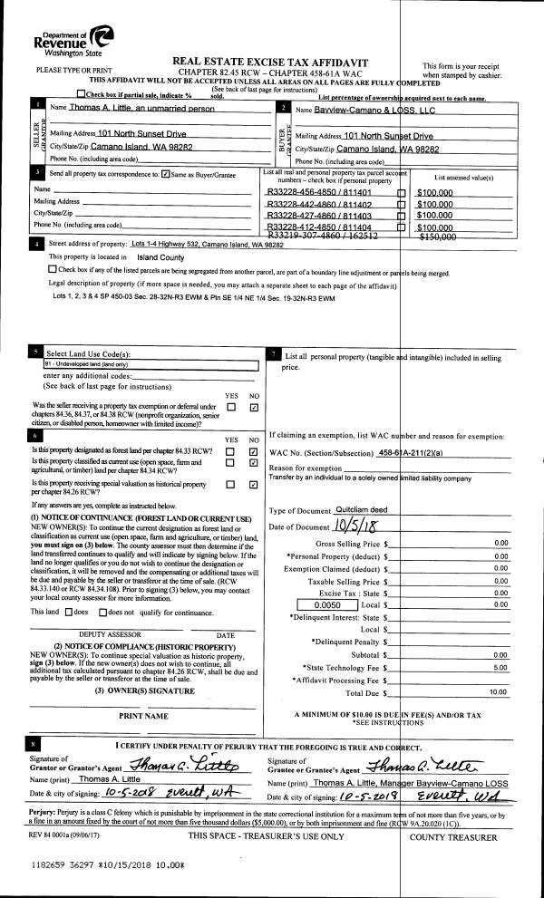 | 1 | 10/05/2018 | QCD | Quit Claim Deed | LITTLE, THOMAS A | BAYVIEW-CAMANO & LOSS LLC | | | $0.00 | 36297 | 4453440 |