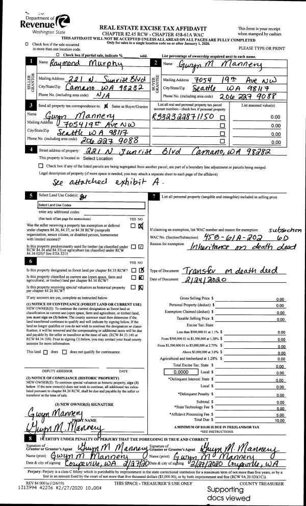 | 2 | 02/24/2020 | TOD | Transfer On Death Deed | MURPHY, RAYMOND J | MANNERY, GWYN MARIE | | | $0.00 | 42236 | 4479583 |