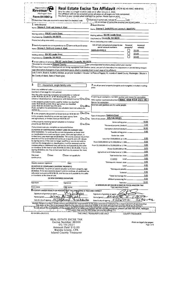 | 1 | 05/16/2021 | QCD | Quit Claim Deed | SMITH, BRIENNE K | SMITH JTWROS, BRIENNE | | | $0.00 | 48300 | 4519654 |
